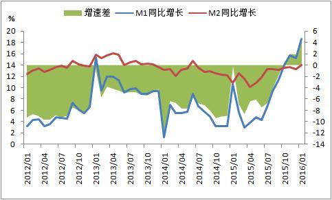 2016年1月末,M1和M2分別同比增長18.6%、14%,增速較上月同期提高3.4和0.7個(gè)百分點(diǎn)。其中,M2增速攀升,主要是信貸投放帶動(dòng)派生存款大幅增加。M1增速攀升,主要是1月份央行通過開展逆回購、MLF、SLF等多元化貨幣政策工具向市場凈投放逾萬億元基礎(chǔ)貨幣。