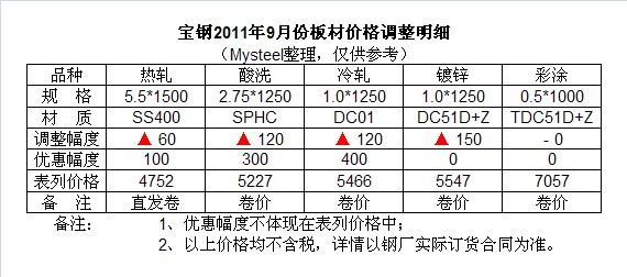 表一:2011年9月寶鋼主流板材品種價格調(diào)整明細(xì)