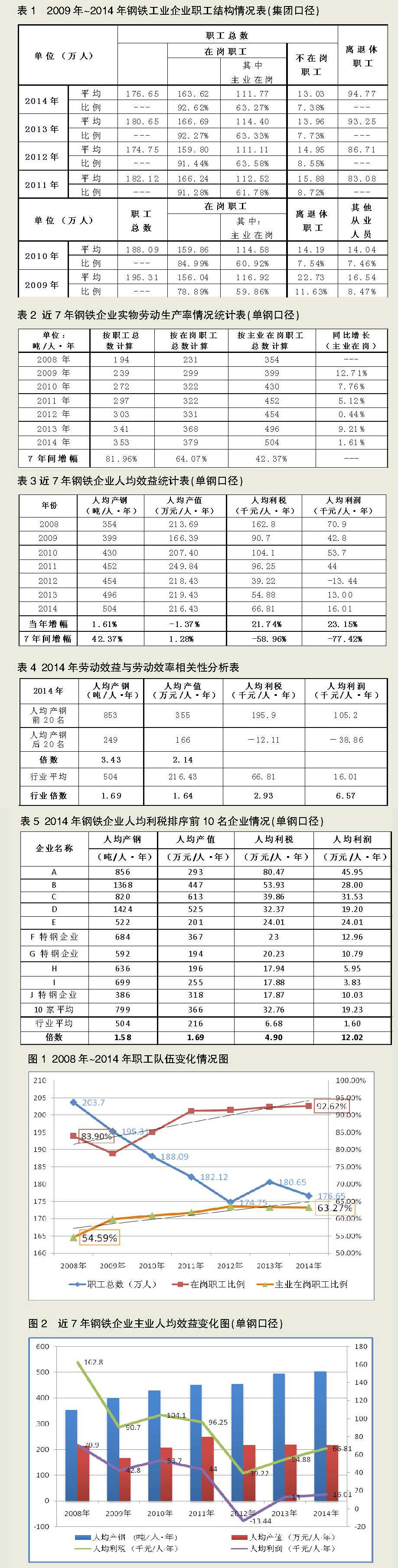 表2顯示,2014年,按單鋼口徑計算,會員企業(yè)生產(chǎn)粗鋼總量為5.64億噸,按職工總數(shù)160萬人計算,則人均年產(chǎn)鋼約為353噸;按在崗職工149萬人計算,則人均年產(chǎn)鋼約為379噸;按主業(yè)在崗職工112萬人計算,則人均年產(chǎn)鋼約為504噸。從2008年到2014年的7年間,按職工總數(shù)、在崗職工人數(shù)、主業(yè)在崗職工人數(shù)計算,實物勞動生產(chǎn)率分別增長了81.96%、64.07%、42.37%。數(shù)據(jù)充分顯示,鋼鐵行業(yè)人力資源工作者通過積極的人力資源結(jié)構(gòu)優(yōu)化工作,實物勞動生產(chǎn)率明顯提高。